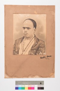 Stained mount. Mildly deteriorated print. Hand painted, Studio solo portrait, bust shot image of a man with high forehead, with a customary symbol (potu) on it, wearing a coat, a long bordered stole (angavastiram), around his neck, facing a side. Plain background. Guptha Studio, Tirupur is printed on the mount.