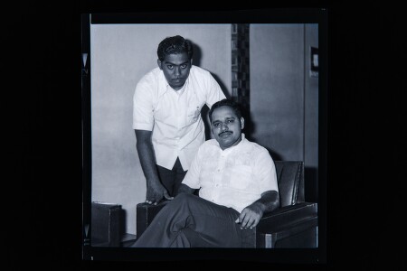 Indoor portrait. Image of 2 men present in a room. A man is sitting on the sofa wearing shirt and pant. Another man is standing near him at the right side, slightly bent down wearing shirt and pant.