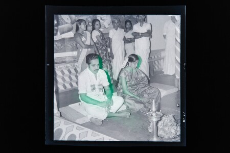 Indoor portrait. Pink washed image. Wedding event. The wedding couple are sitting wearing shirt,veshti,saree,jewells,customary symbol on the forehead(pottu) and flower garland(poomalai). Family members are standing behind in the image.