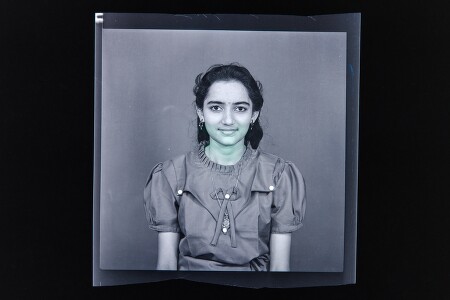 Studio portrait. Pink washed image. Half length shot. Image of a girl sitting wearing frock,long chain with pendant,earring and customary symbol on the forehead(pottu). The background is plain.