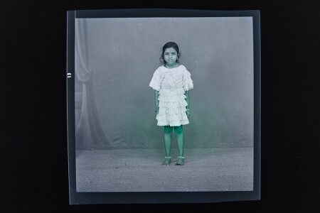 Studio portrait. Pink washed image. Solo portrait of a a girl standing against a studio backdrop. She is wearing frock, bangles,chain,earring,anklet(gholusu),customary symbol on the forehead(pottu).