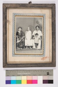 Stained mount. Studio group portrait, full-length shot image of a woman in silk saree, adorned with jewels sitting on the real right side, a widow old woman wearing saree without blouse is sitting in the middle, a man in shirt and veshti is sitting on the real left side, a small boy is standing leaning on him. All facing the camera. Backdrop is painted with images of wall, pillar and window. Mitra studio, Tirunelveli is printed on the mount.