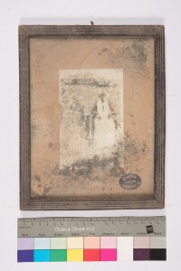 Deteriorated print. Studio solo portrait, full-length shot image of an old man weairng veshti and stole, sitting on a chair and facing the camera. Painted and vague background. Chitra studio, Tirunelveli is printed on the mount.