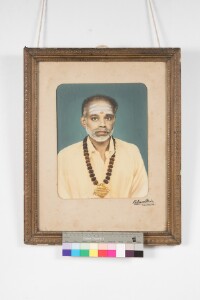 Hand coloured print. Studio solo portrait, half length shot image of a man wearing shirt, with thick rosary chain made of rudraksha and a big pendant, with shaivite symbol (patai), on his forehead, facing the camera. Plain background. Kalpana studio, Thirunelveli is printed on the mount.