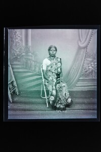 Pink washed image. Studio solo portrait, full-length shot image of a woman wearing saree, sitting on a chair and facing the camera. Backdrop is painted with images of wall, pillar, stairs, nature and curtain. Chairs are placed against the wall on the side.
