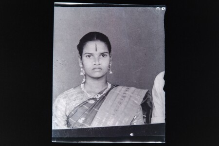 Recopy image. Studio solo portrait, half-length shot image of a woman wearing saree, adorned with jewels and flowers, facing the camera. Plain background.