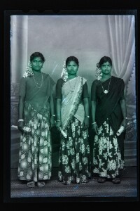 Pink washed image. Studio group portrait, full-length shot image of 3 women, wearing half-saree, adorned with jewels and flowers, standing beside each other, holding a rolled sheet in hand and facing the camera. Backdrop is painted with images of wall, pillar, stairs, nature and curtain. Floor is carpeted.