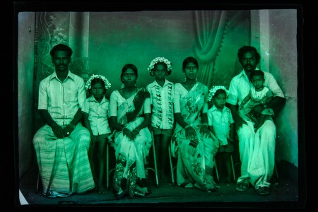Pink washed image. Studio group portrait, full-length shot image of 2 men wearing shirt and veshti, one of them carrying a baby, 2 women in saree are sitting beside each other, 3 small children wearing shirt, trousers and flowers are standing in between those sitting, all facing the camera. Backdrop is painted with images of wall, pillar, stairs, nature and curtain. Floor is carpeted.