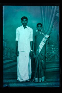 Pink washed image. Studio couple portrait, full-length shot image of a man wearing shirt and veshti, woman wearing silk saree, adorned with jewels and flowers, are standing beside each other and facing the camera. Backdrop is painted with images of wall, pillar, stairs, landscapes and curtain. Floor is carpeted.