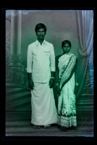 Pink washed image. Studio couple portrait, full-length shot image of a man wearing shirt and veshti, woman wearing saree, adorned with jewels, standing beside each other and facing the camera. Backdrop is painted with images of wall, landscapes, pillar, stairs and curtain. Floor is carpeted.