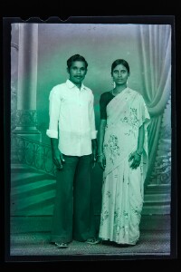 Pink washed image. Studio couple portrait, full-length shot image of a man wearing shirt and pants and woman wearing saree, adorned with jewels and flowers, standing beside each other, facing the camera. Backdrop is painted with images of pillars, wall, stairs and curtain. Floor is carpeted.