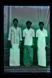 Pink washed image. Studio group portrait, full-length shot image of 3 men wearing shirt, veshti and watch, standing beside each other and facing the camera. Backdrop is painted with images of wall, stairs and curtain. Floor is carpeted.