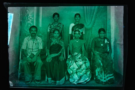 Pink washed image. Studio group portrait, full-length shot image of 2 women in saree, a man in shirt and pants and a young woman in half-sare, adorned with jewels, braided hair adorned with flowers and jewels, sitting on chairs, in the front row, 2 women in saree are standing at the back. All facing the camera. Backdrop is painted with images of wall, pillar and curtain. Floor is carpeted.