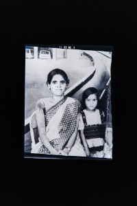 Mildly deteriorated image. Studio portrait, three-forth length shot image of a woman wearing saree, sitting on a chair on the real right side, and a small girl wearing frock is standing on the real left side, both facing the camera. Backdrop is painted with images of parking lot.
