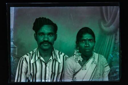 Pink washed image. Studio couple portrait, bust shot image of a man wearing shirt and woman wearing saree, adorned with flowers and ornaments, sitting beside each other and facing the camera. Backdrop is painted with images of wall, pillar and curtain.