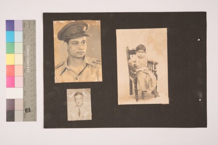 Indoor portrait. There are 3 images on the album sheet. 2 images have passport size frame of a man wearing different uniforms. Third image has a small boy sitting on the chair.