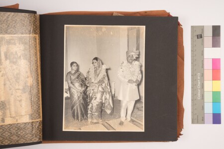 Indoor portrait. Wedding event. Portrait of bride and groom standing with a lady.