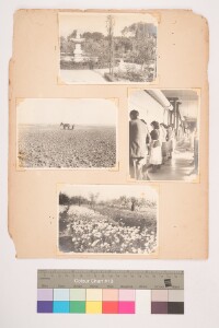 Outdoor portrait. There are 4 images on the album sheet. Portraits of flower garden,workers working inside a factory and a barren land.
