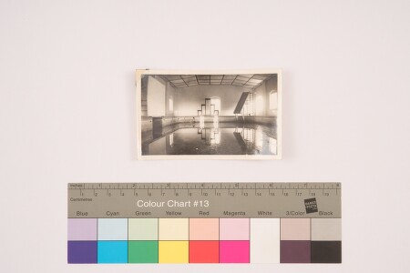 Indoor portrait. Portrait of a room having windows and ladders. The floor is filled with water.