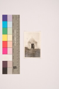 Outdoor portrait. Slight deterioration. Portrait of a small monument. A man is standing outside and praying.