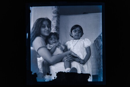 Indoor portrait. Slight biological deterioration. Portrait of a lady sitting with 2 childrens. The image is taken insdie the house.