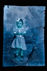 Studio portrait. Deterioration with black spatched on the top. Pink wash. Full length shot. A little girl sitting on a wooden chair with hands together. She is wearing frock, bangles, long chains, Ottiyanam (waist belt), side bun (andal Kondai) with flowers, anklet and cut-shoes. She is facing the camera. Background has staircase as paintings.
