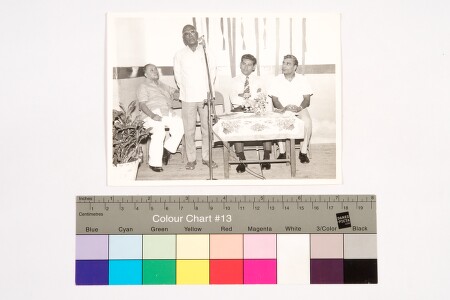 Indoor portrait. Full length shot. Old man adressing a speech with hand on the back in front of a mike. On both side 3 man are sitted and looking at him. They are wearing pant, shirt, tie and shoes. Background has garland and on the real right, there is a plant.