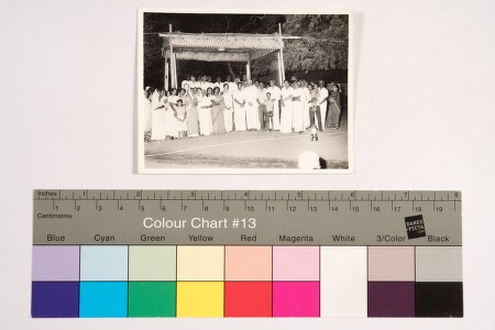 Outdoor portrait; Full elnght hsot. Group portrait; there are more than 50 persons. Men, women, boys and girls are standing below of a pandal and facing the camera. Woman are wearing saree with head covered, men are in pant, veshti and shirt, girls in frock and boys in shirt and trousers.