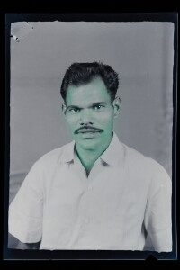 Studio portrait, bust shot, solo portrait, pink washed image of a man wearing a shirt, facing side. Plain backdrop.