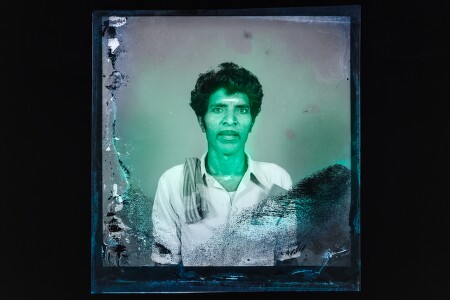Studio portrait. Humidity deterioration on the right and below the negative. Pink washed image. Half length shot. A man is wearing a shirt and towel on his right shoulder. He is having sacred ash(thirunoor) on his forehead. The background is plain.