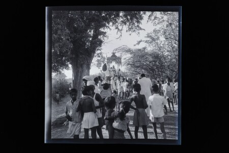 Outdoor photograph of christian fathers wearing cassock and riding on a decorated bullock cart. A group of men and children are walking infront of the cart, in a roadway. Trees seen on both the sides of the road.