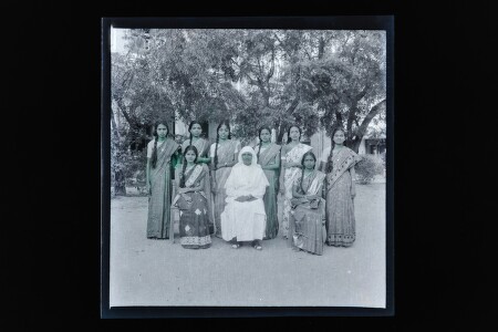 Outdoor potrait, full-length shot, pink washed image of 6 women wearing saree standing next to ach other and facing the camera. 2 women in saree, a nun is habit is siting on a chair, facing the camera. Building and trees are seen at the background.