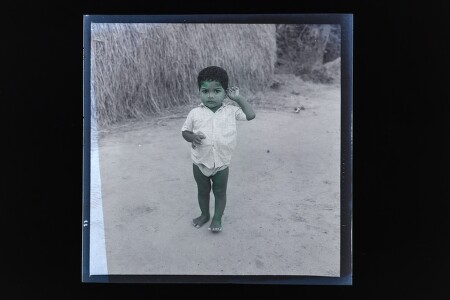 Outdoor portrait. Pink wash. Full length shot. Solo portrait of a child standing wearing shirt and trouser. Background has a mount of thatch on the right side.
