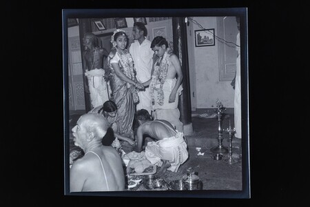 Indoor portrait. Full length shot. Marriage event. Bride is standing on Ammikuzhavi (the roller stone where- with the grinding is done), wearing saree,flower garland(poomalai),bangles,nose studd(mukuti),ear studd(thodu),forehead chain(neticuti) and customary symbol on the forehead(pottu). The groom is standing opposite to her wearing veshti and flower garland (poomalai) holding her right hand. A man is bending down towards the brides foot on his toe fingers, wearing veshti and sacred thread (punul) on his body. He is adjusting the toe ring of the bride. Another lady is sitting the other side helping the man in adjusting the toe ring. Two man are standing behind near the pillars. Two bronze lamp is present on the left side of the image. Priest is sitting on the rigth side wearing the sacred thread(punul). There are coconuts and herbs kept on plate and small containers for the ritual on the floor.