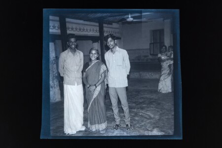 Indoor portrait. Silver deterioration. Full length shot. There are two men standing with a lady in the middle on the right side of the negative. A lady is standing at the left side of the negative carrying a baby in her waist. The photograph is taken inside a house.