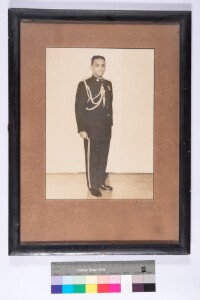 Studio solo portrait, full-length shot image of a man wearing uniform, and shoes, standing on a side in attention and facing the camera. Plain background.