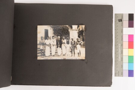Album sheet. Outdoor group portrait, full-elngth shot image of 3 men stadning in the middle with 5 boys dressed up for fancy dress competition, standing beside them, outside a building and facing the camera. Photo taken on Fancy dress, at Tutorial college in 1936.
