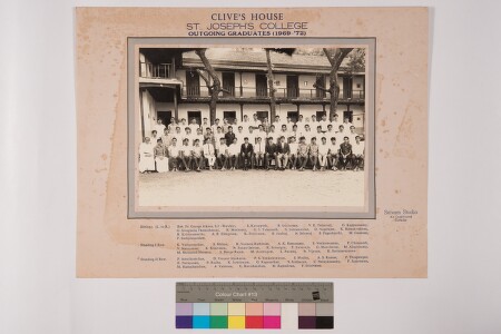 Mildly deteriorated print. Outdoor group portrait, full-length shot image of more than 40 men, most of them wearing shirt and pants, sitting and standing in 3 rows, outside a building and facing the camera. They are the outgoing graduates of St. Joseph's college, Clive's House (1969-72 batch). Their names are written on the bottom of the mount. Selvam Studio Trichy is printed on the mount.