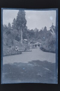 Outdoor photograph, long shot image of a hut house on a garden and a man sitting on a garden.