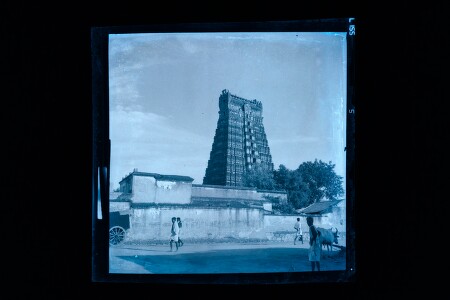 Outdoor photo. Back side, corner view of the temple tower (Gopuram). On the bottom of the temple there are a house, bulock with cart, Four men. Three men are shirtless, wearing veshti, towel and one man is wearing shirt. There is tree between the temple and the house.