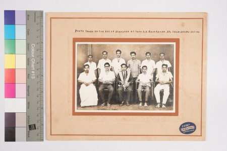 Studio, group portrait, full-length shot of 5 men sitting on the front row and 6 men wearing shirt standing behind. The man sitting in the middle is wearing blazer and garland. Photo taken on the eve of transfer of thiru. K.R.Rajaraman, special Tahsildar, dated: April 1968. Backdrop is vague. Raju studio, Kumbakonam is printed on the mount.