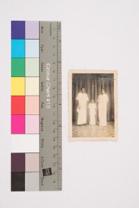 Studio portrait, full-length shot of 2 men wearing shirt and veshti on the real right and left corners. A small boy wearing shirt and veshti is standing in the middle. All facing the camera. Curtain is seen at the background. Floor is carpeted.