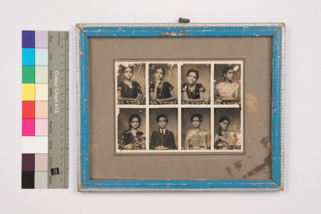 Grey mount. Mildly deteriorated print, photo montage, studio solo portraits, bust shot image of a girl, with 8 different photos of the same girl wearing different attires, giving different poses. Facing the camera and the sides.