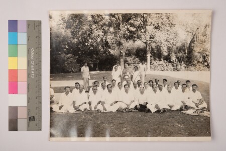 Outdoor portrait.Sepia tone. There are approximately 30 persons. Men are sitting with crossed legs on the lawn. Behind them Mrs. Indira Priyadarshini Gandhi (was an Indian stateswoman and central figure of the Indian National Congress. She was the first and, to date, the only female Prime Minister of India) is standing with a document on her left hand. She is wearing saree and watch. Next to her 2 woman and 3 men are standing. Background has trees.