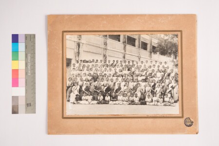Outdoor portrait. Slight sepia tone. Full length shot. Group portrait. There are more then 50 persons in this photograph. Woman, young girl and small girl of "Savithri Vidyasala Hostel" 1956-57" (written on the building). Woman are wearing saree and are sitting and standing. Small girls are sitting on the floor with crossed legs and they are wearing skirt and blouse (pavadai satai). It is written below the photo March 1957 and on the real left corner "Ponniah Studio, Trichy, Academy vew".
