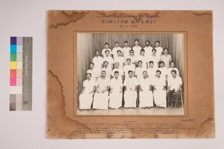 Studio portrait. Slight deterioration on the mount. Full length shot. Group portrait. Second annual celebration of goods parveding kumastakkal sema nidhi, Madurai. 20-2-1966. There are 28 persons. They are wearing veshti and shirt except a man sittied on the real left side, is wearing pant and shirt. The man sitted in the middle is wearing a flower garlands on his neck. It is written on the bottom real left "Chitra Studio'- Madurai".