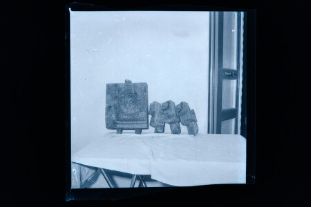 Indoor portrait. Image of broken wooden embossed carving in flower shape, kept over a piece of cloth in a table. The photograph is taken inside a house.