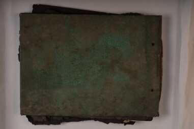 Deteriorated print and mount. Outdoor group portrait, full-length shot image of many men, womena nd few children standing as a group outside a…