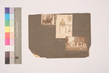 Outdoor portrait. There are three portraits in the album sheet. The images are of R.Santha Bai, a man(Nayena) sitting on the chair and men playing…