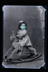 Pink washed. Studio portrait. Girl sitting towards real right, on a toddler rocking horse. She is wearing frock, bangles, chain with pendant, ruban…